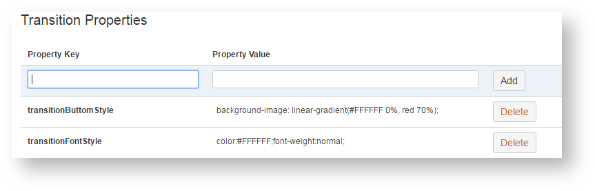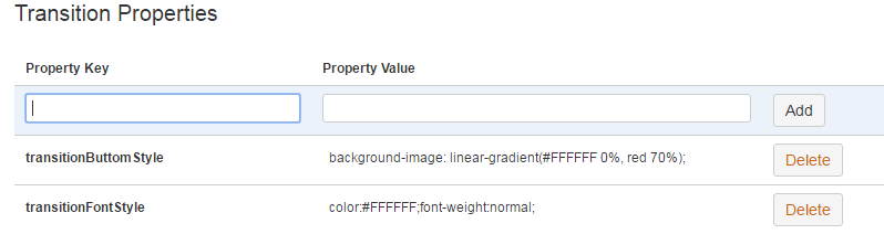 If you opt for a configuration at Transition Level only, you will have to specify, in the Transition Properties, the two CSS styles to apply for Font Color and Button Color.