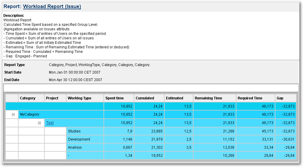 • WorkloadProject Workload Report (Project) : Calculations are done, taking in account the spent Time of all project's issue, not only the identified one.