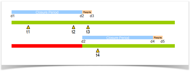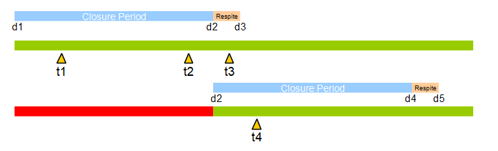 - At time t4, the Closure Period from d1 to d2 is closed.