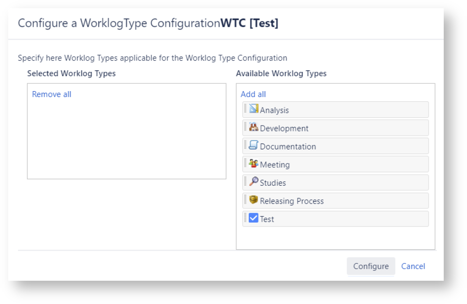 You can create a Worklog Type Configuration by clicking on button Add new Worlog Type Configuration ...
