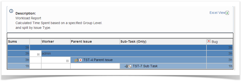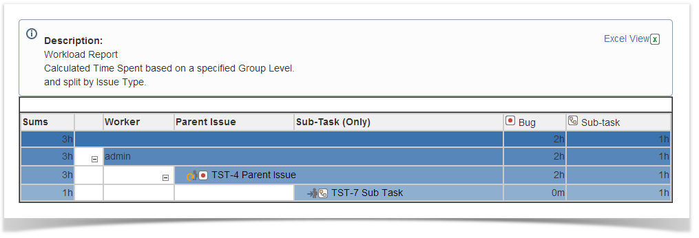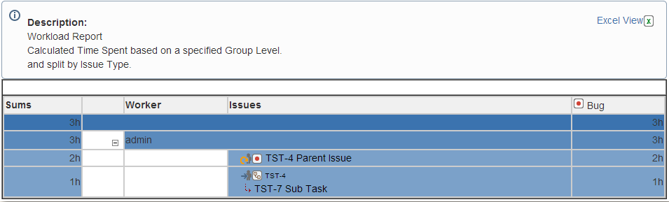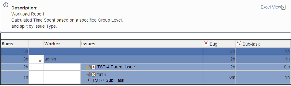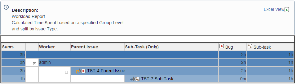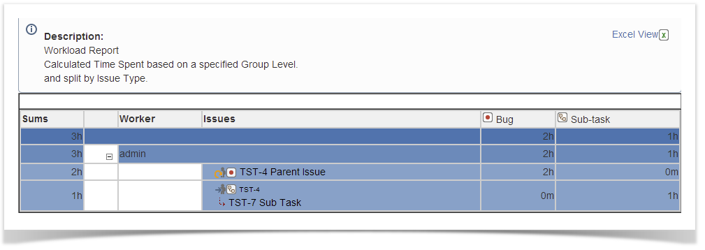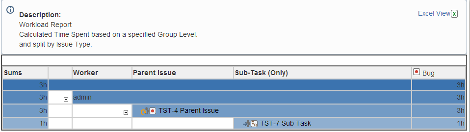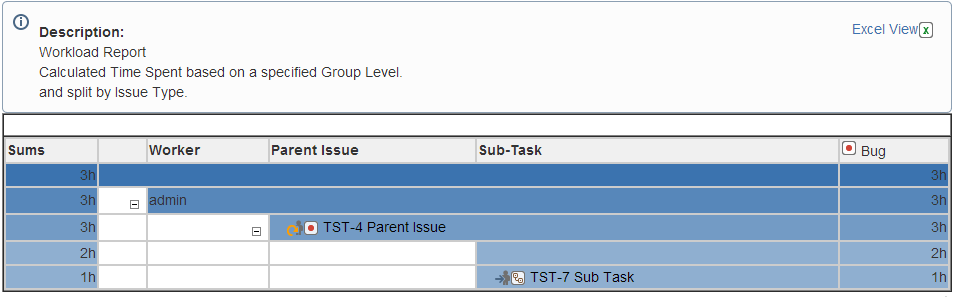 - Their related Worklogs are displayed depending each Issue Type column (Separate columns for Parent Issues and Sub-Task )