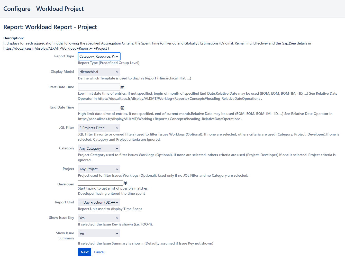 Workload Report (Project) is configured by selecting predefined Report Types giving criteria to use for the aggregation.(See Worklog Reports Concepts)