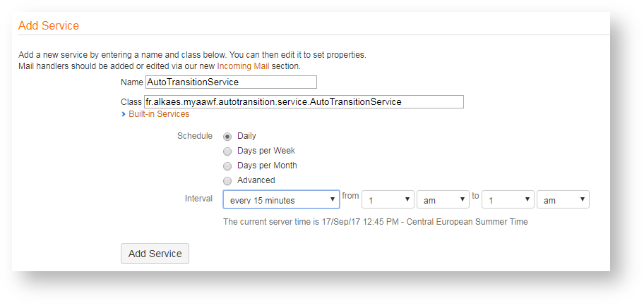 - Add the Class fr.alkaes.myaawf.autotransition.service.AutoTransitionServicein Service Definition and schedule it..