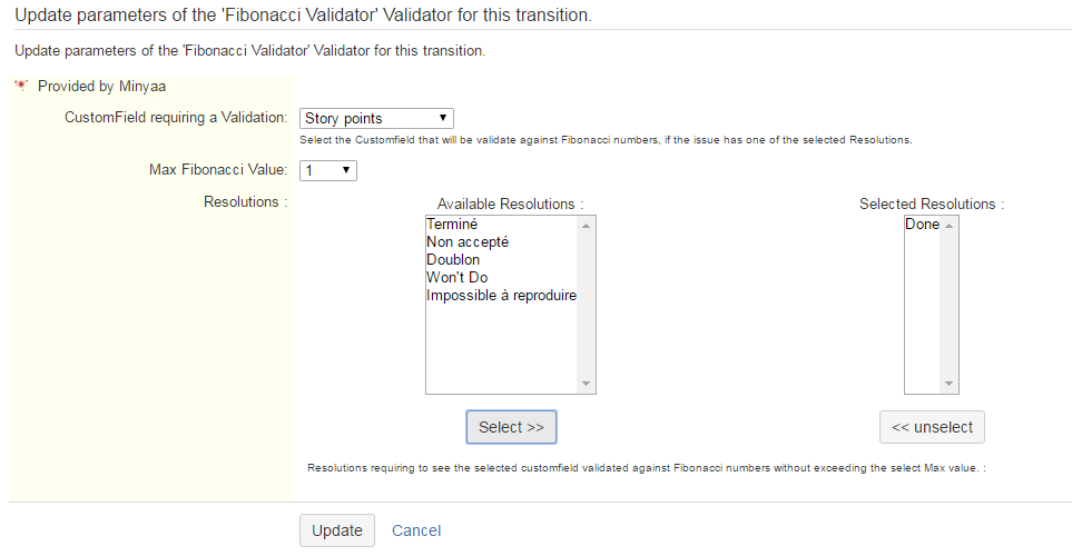 <validator name="" type="class"> <arg name="fibonacciMaxValue">1</arg> <arg name="selectedResolutions">10000,10102,</arg> <arg name="resolutionsSelected">10102,</arg> <arg name="class.name">fr.alkaes.myaawf.workflow.validator.FibonacciOnResolutionValidator</arg> <arg name="customFieldSelected">customfield_10002</arg> </validator> |